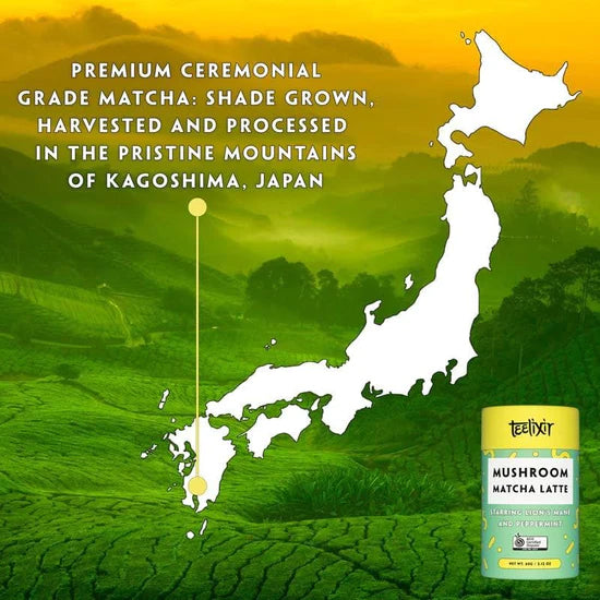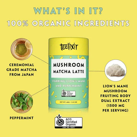 100% Certified Organic Ingredients: Organic Ceremonial Grade Matcha (Japan), Organic Lion's Mane Mushroom (1500 mg per serving), Organic Peppermint