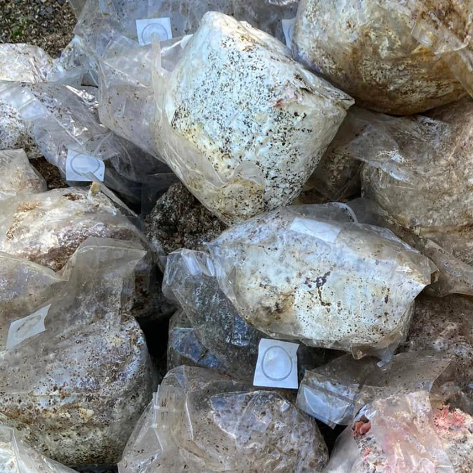 You’ll receive fully spent mushroom blocks, delivered each in a plastic grow bag.